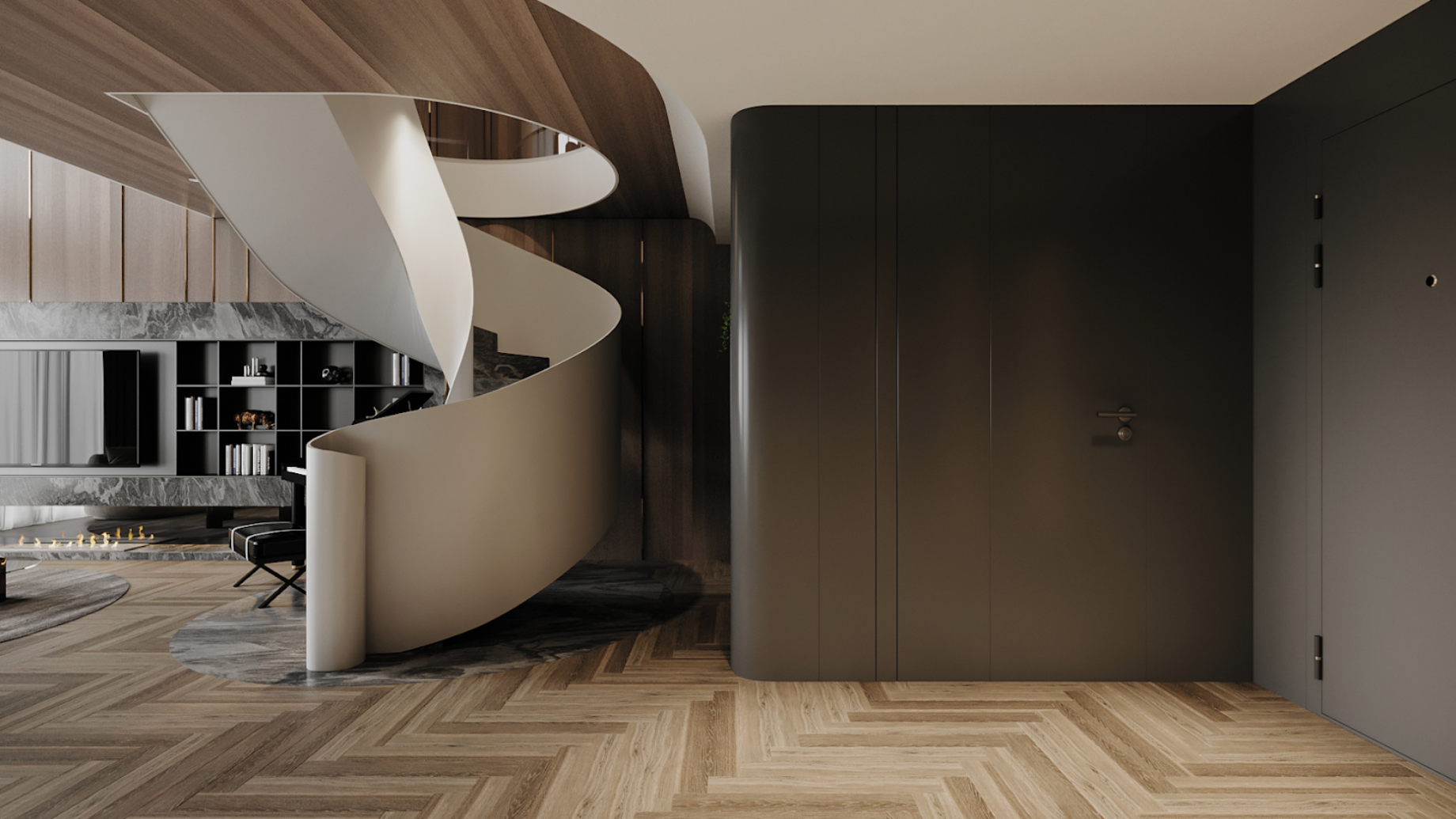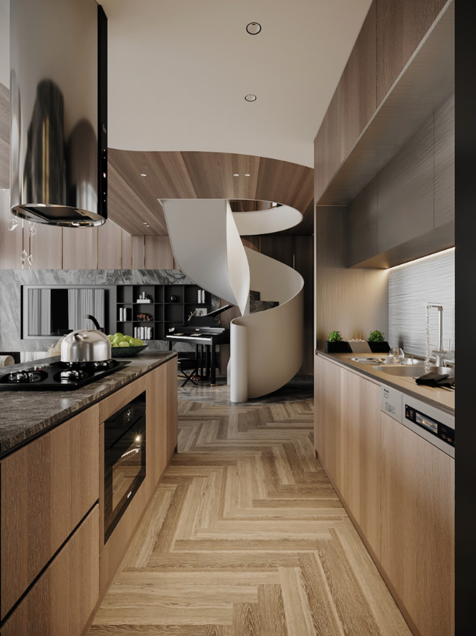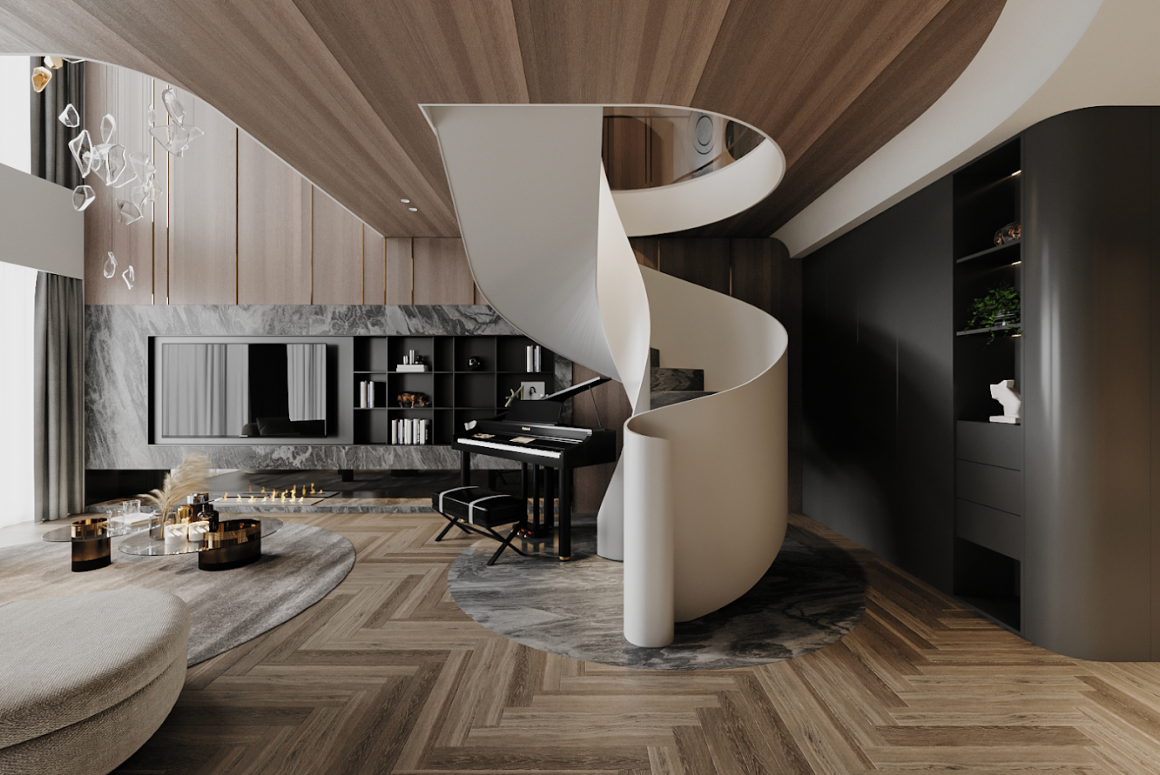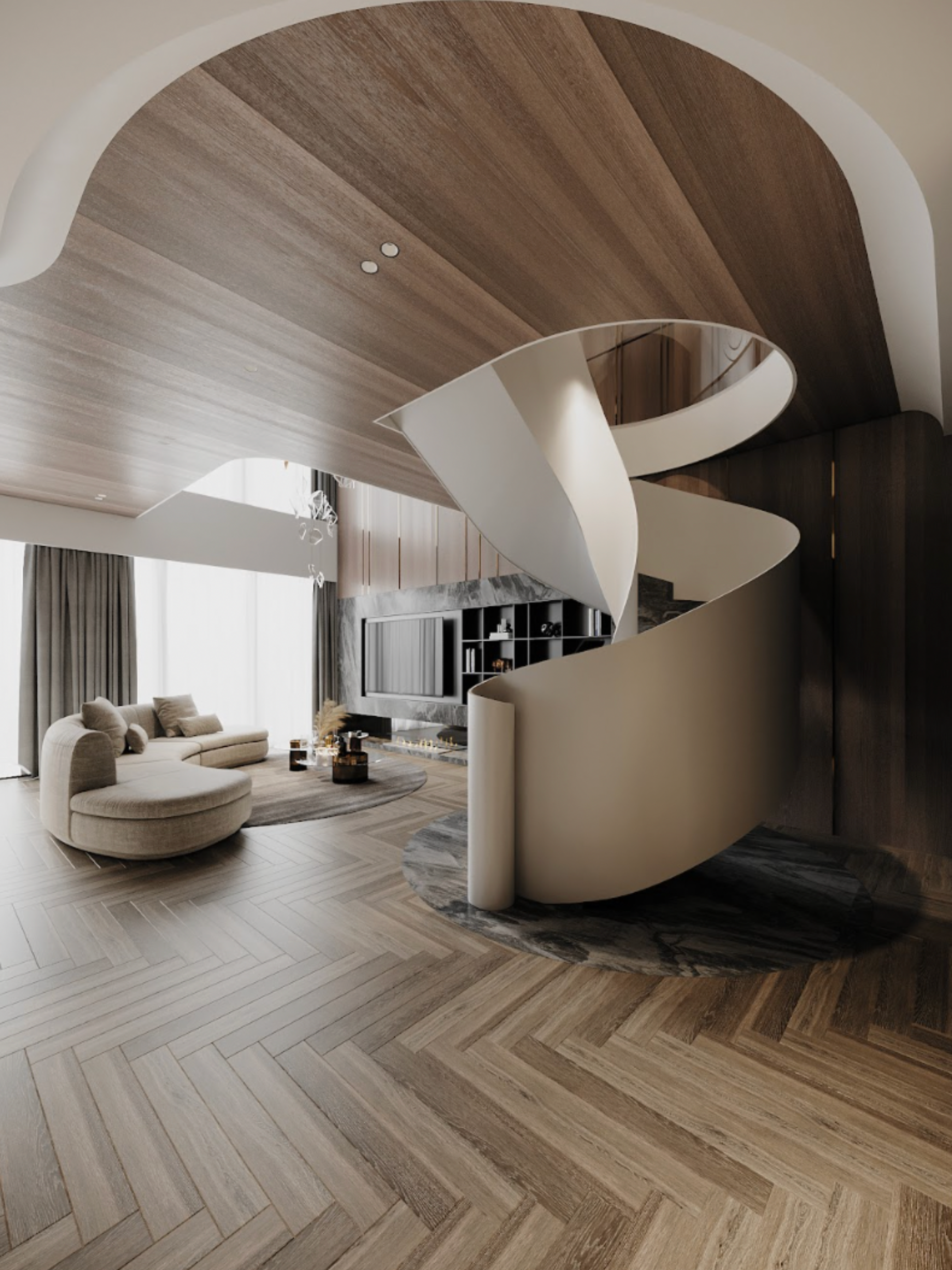 Điểm nhấn trung tâm là cầu thang xoắn ốc - không chỉ đóng vai trò kết nối hai tầng, mà còn như một tác phẩm điêu khắc mềm mại giữa không gian. Dưới ánh sáng ấm, từng đường cong trở nên sống động, tạo cảm giác dòng chảy liên tục, nơi kiến trúc không còn là khối tĩnh mà trở thành một phần của nhịp sống.