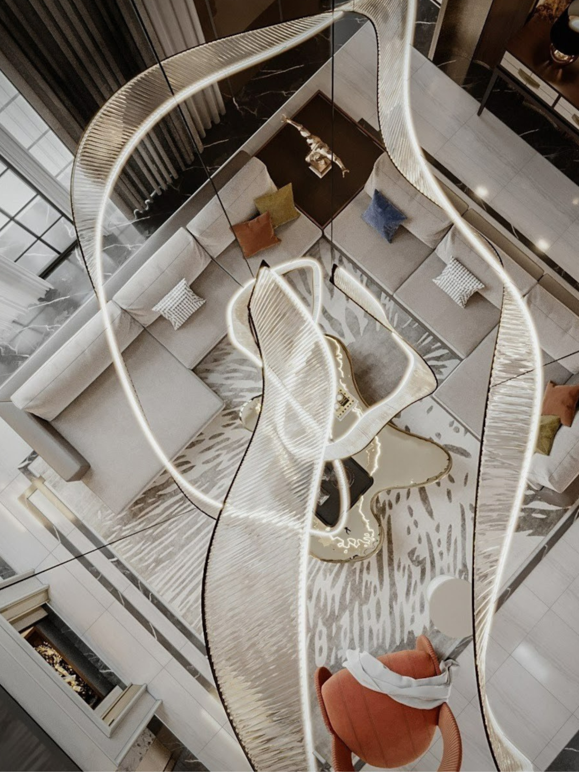Ánh sáng và hình khối kiến trúc cùng nhau khiêu vũ tạo nên một không gian đậm chất nghệ thuật. Những đường cong uốn lượn mềm mại của hệ đèn trần đối lập với những mảng khối vuông vức, gãy gọn của nội thất, tạo nên sự cân bằng thị giác hoàn hảo. Mọi giới hạn không gian dường như bị xóa nhòa bởi sự phản chiếu lấp lánh và đa chiều.