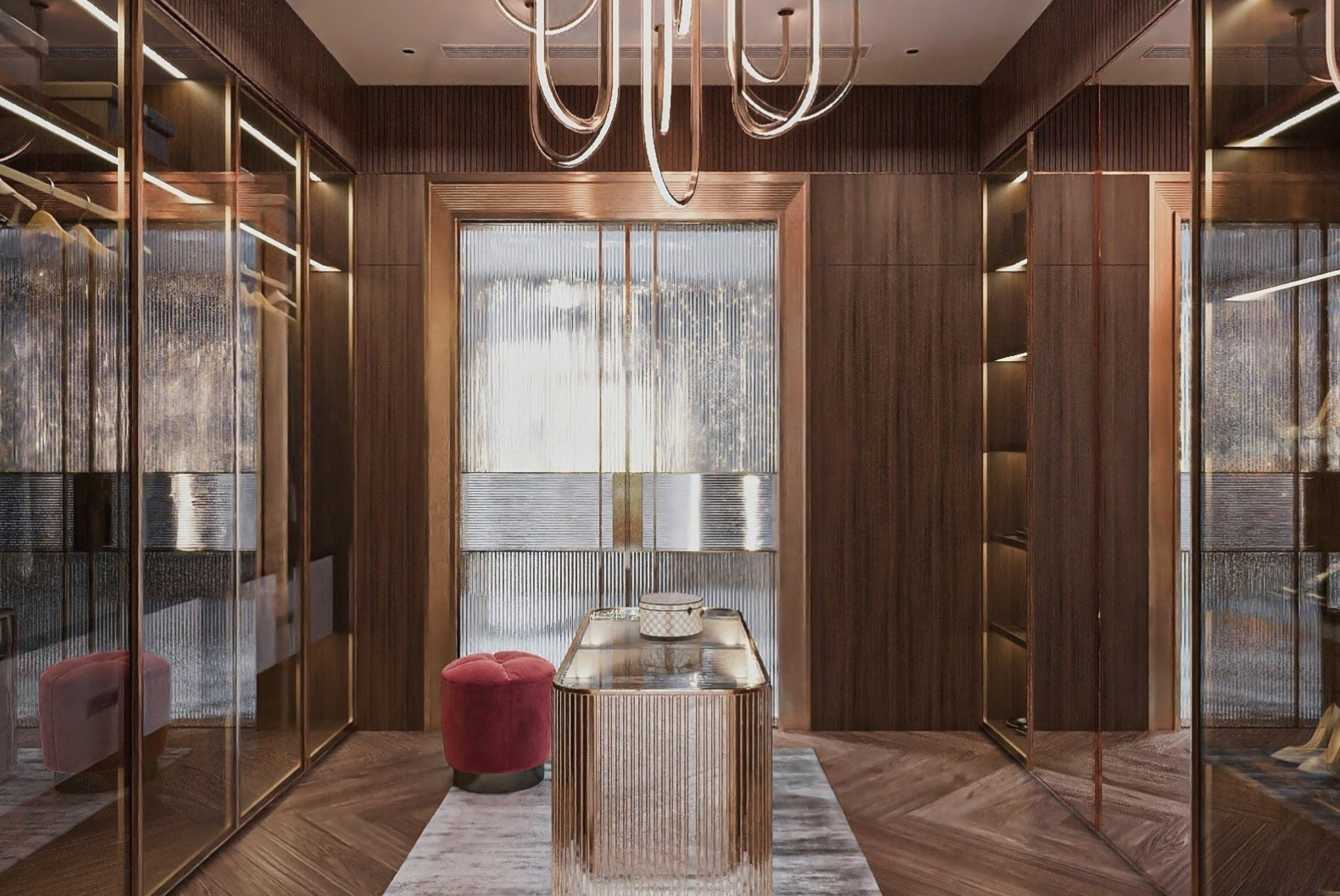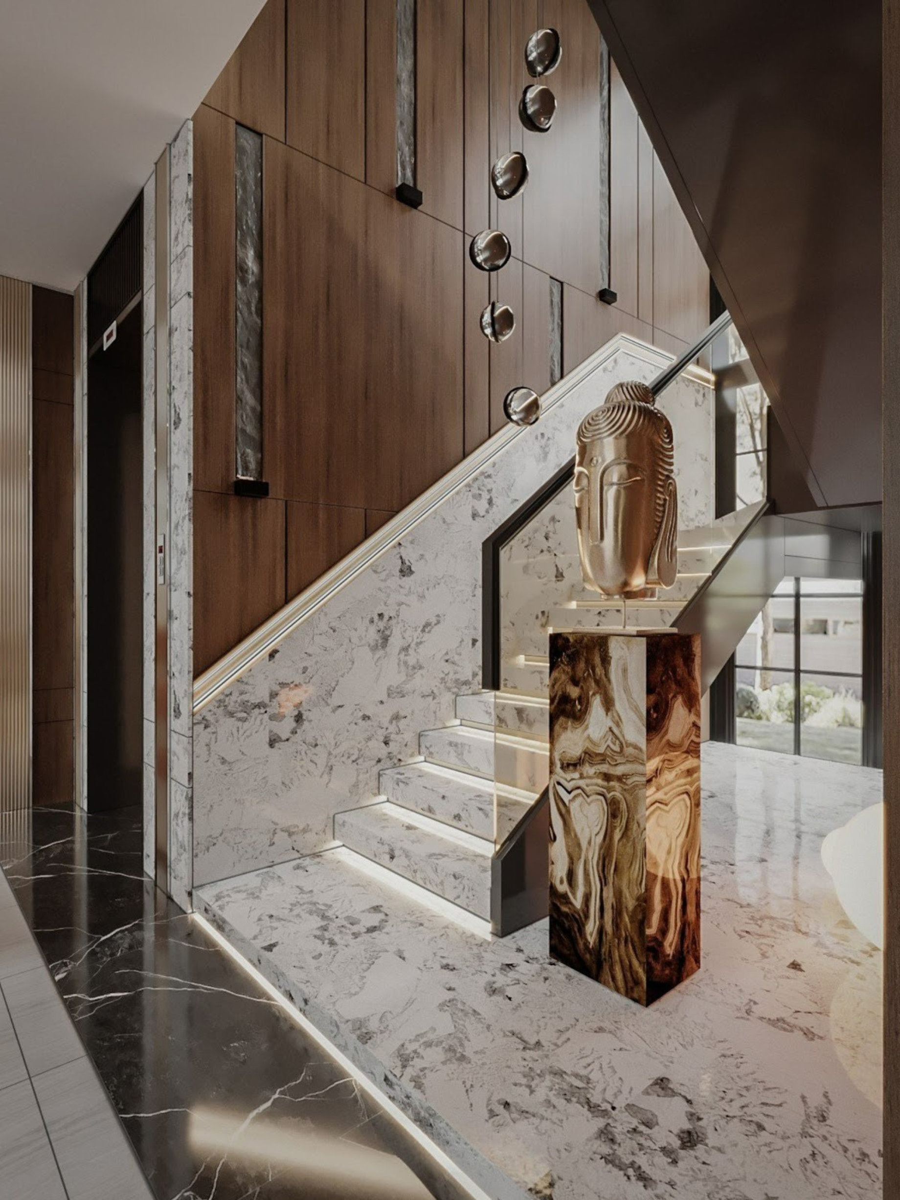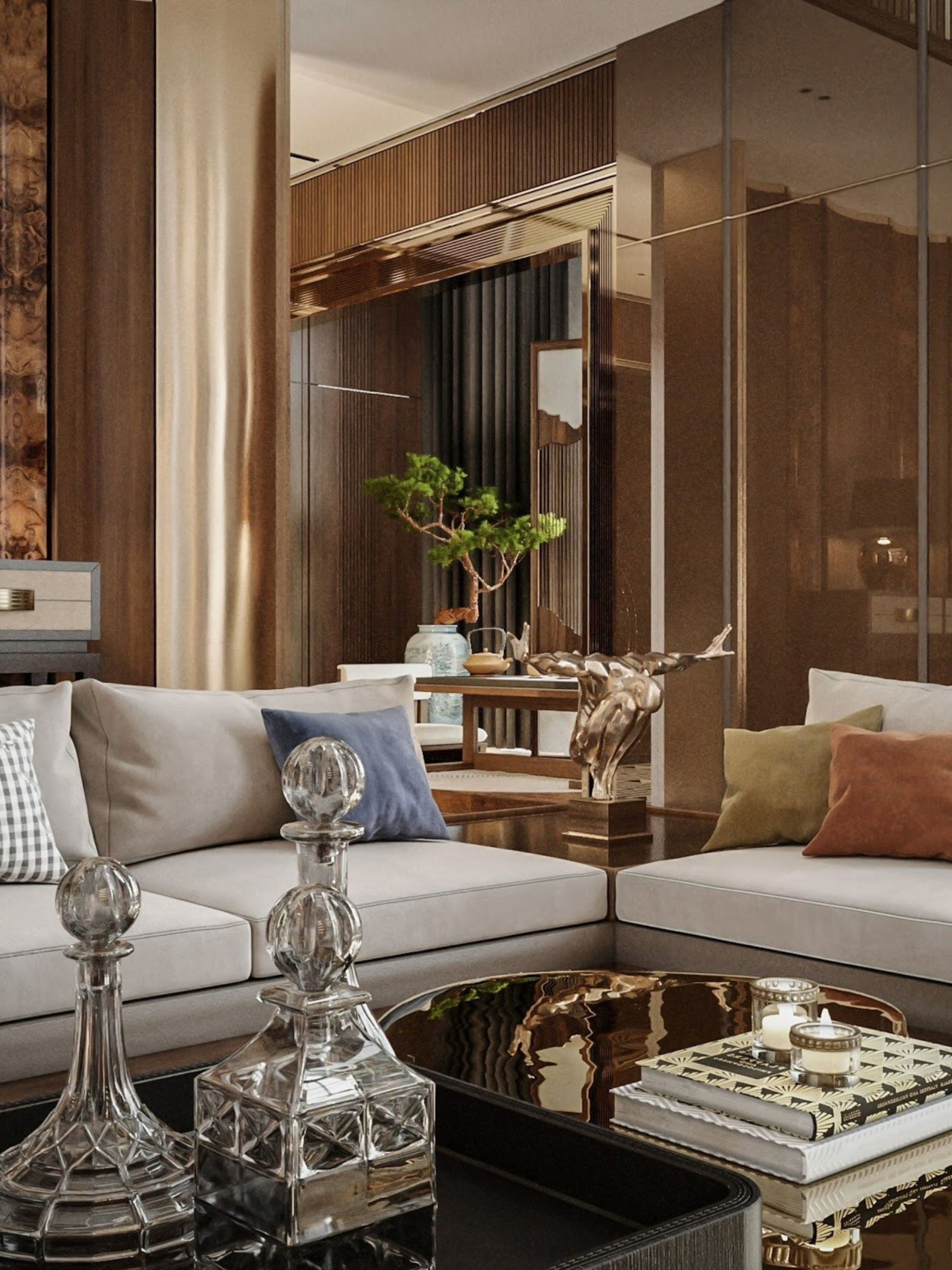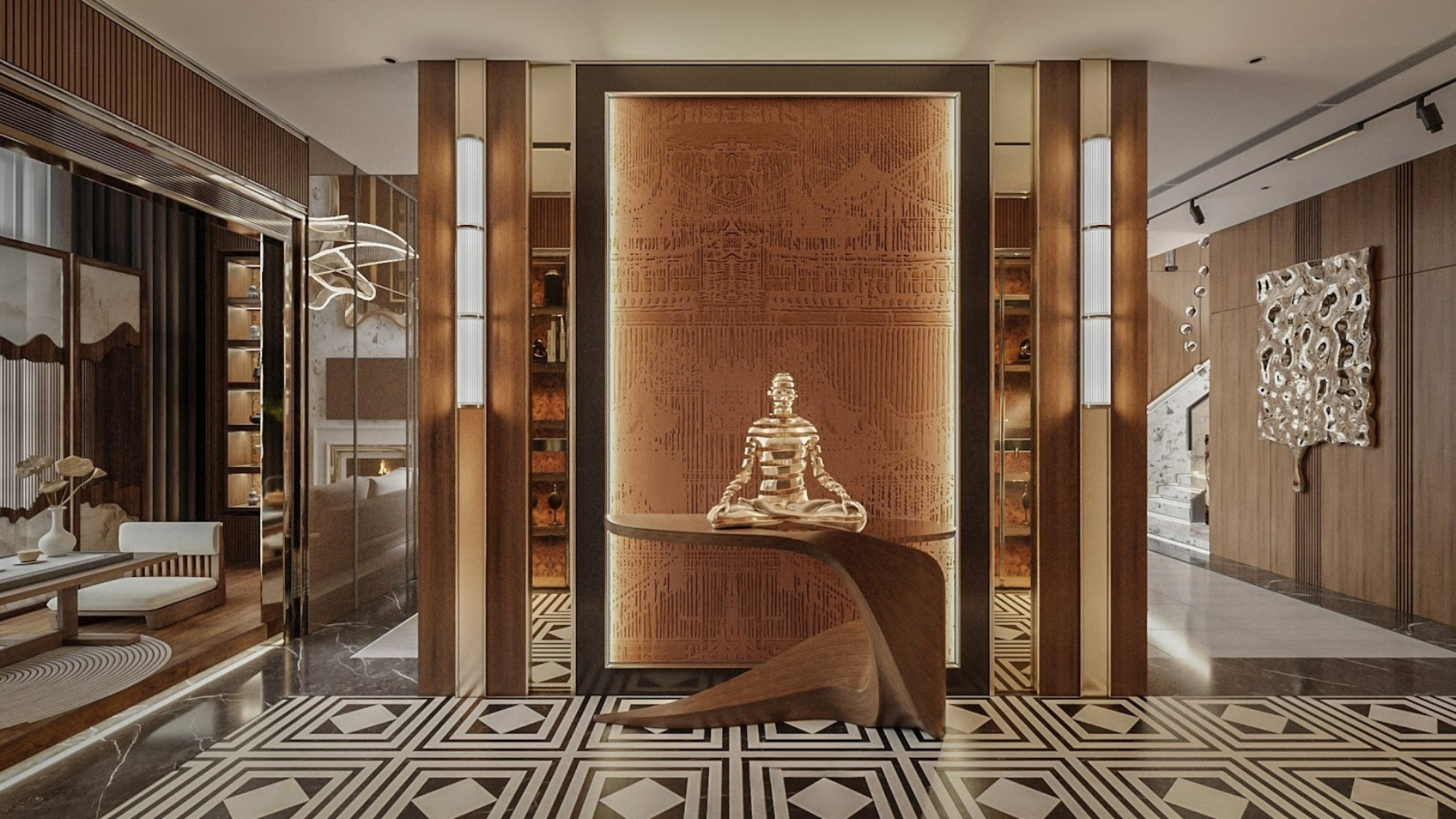 Mỗi chi tiết nội thất đều được chế tác "may đo" tỉ mỉ như một món trang sức quý giá. Sự chuyển tiếp mượt mà giữa các chất liệu, từ bề mặt kính trong suốt, kim loại bóng bẩy đến đá vân mây tự nhiên, kiến tạo nên một dòng chảy cảm xúc liền mạch, mang lại trải nghiệm hưởng thụ đỉnh cao trong từng khoảnh khắc.