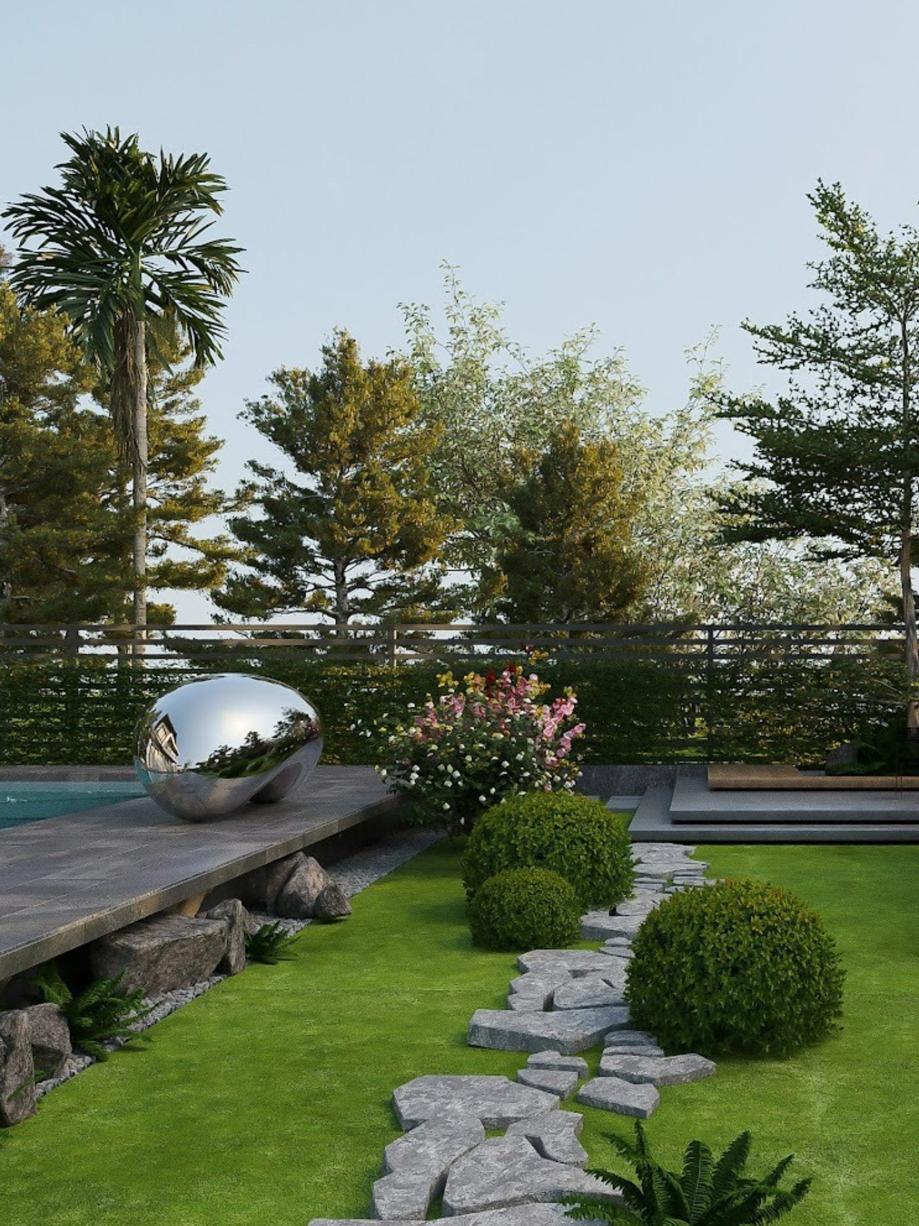 Kiến trúc mở (Open-concept) được khai thác triệt để nhằm tối ưu hóa trải nghiệm sống xanh. Dòng chảy không gian luân chuyển nhịp nhàng từ khu vực sinh hoạt chung ra đến hồ bơi và sân vườn. Tại đây, gia chủ có thể tận hưởng những khoảnh khắc thư giãn tuyệt đối giữa thiên nhiên mà vẫn đảm bảo sự riêng tư kín đáo.