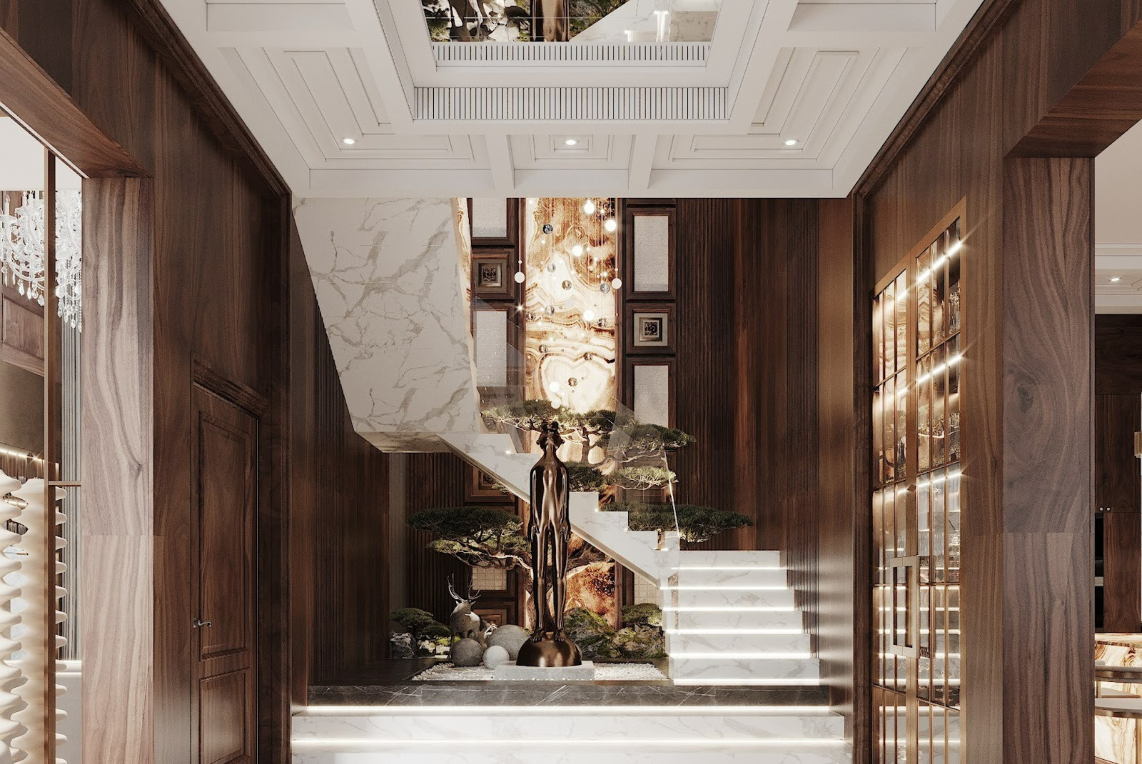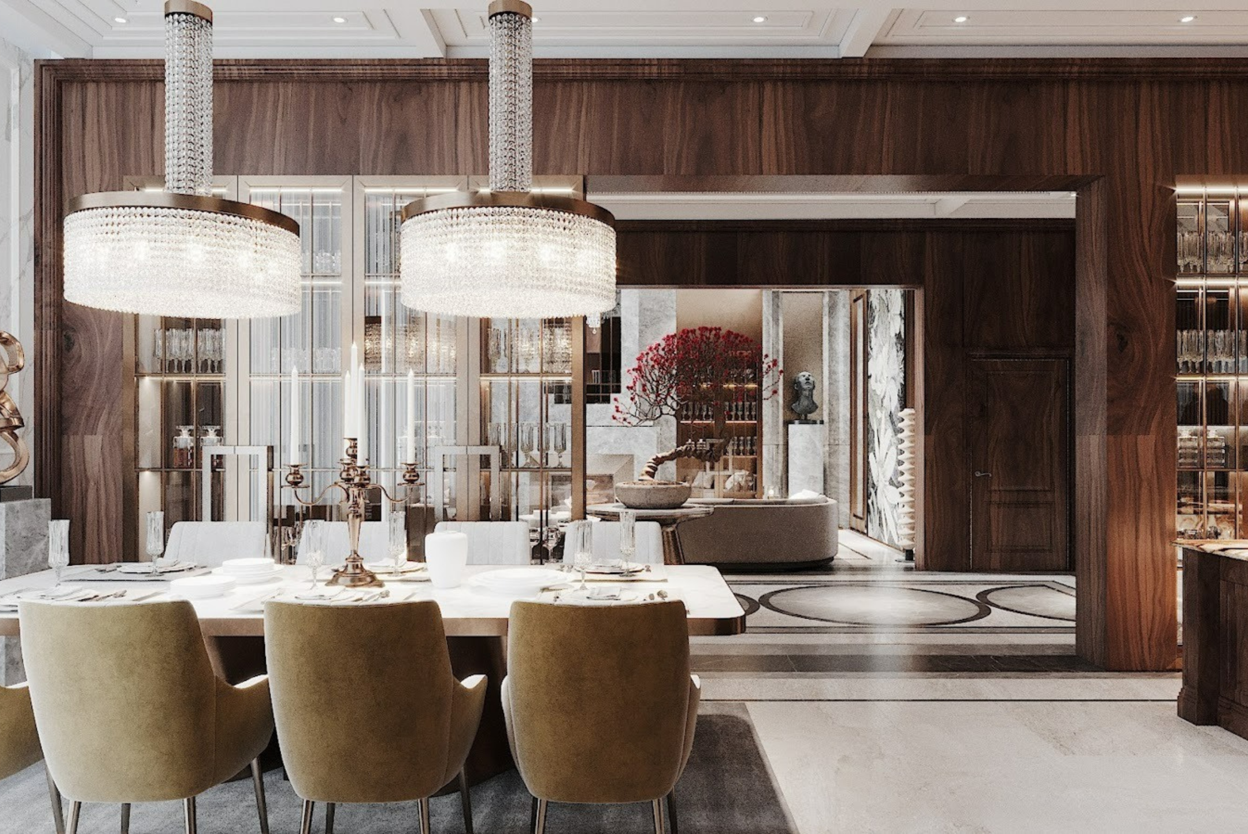 Ánh sáng trở thành chất liệu kiến trúc đắt giá, len lỏi qua khoảng không gian bề thế để đánh thức từng thớ vân vật liệu. Không gian luôn duy trì độ "mở" đầy cảm xúc, nơi sự lộng lẫy của ánh đèn pha lê hòa quyện cùng chiều sâu của nội thất gỗ, tạo nên một bầu không khí vương giả nhưng đầy thi vị.
