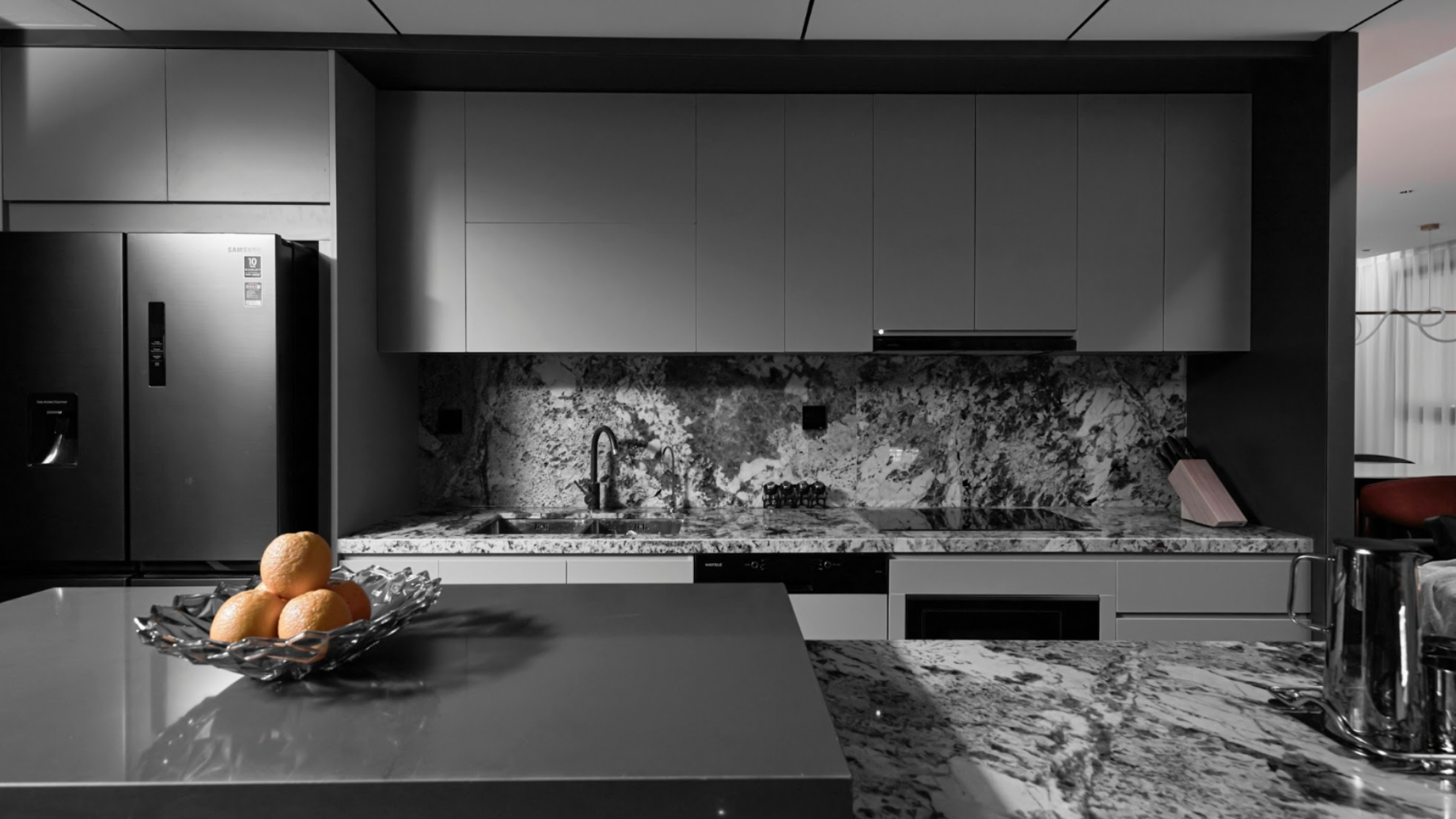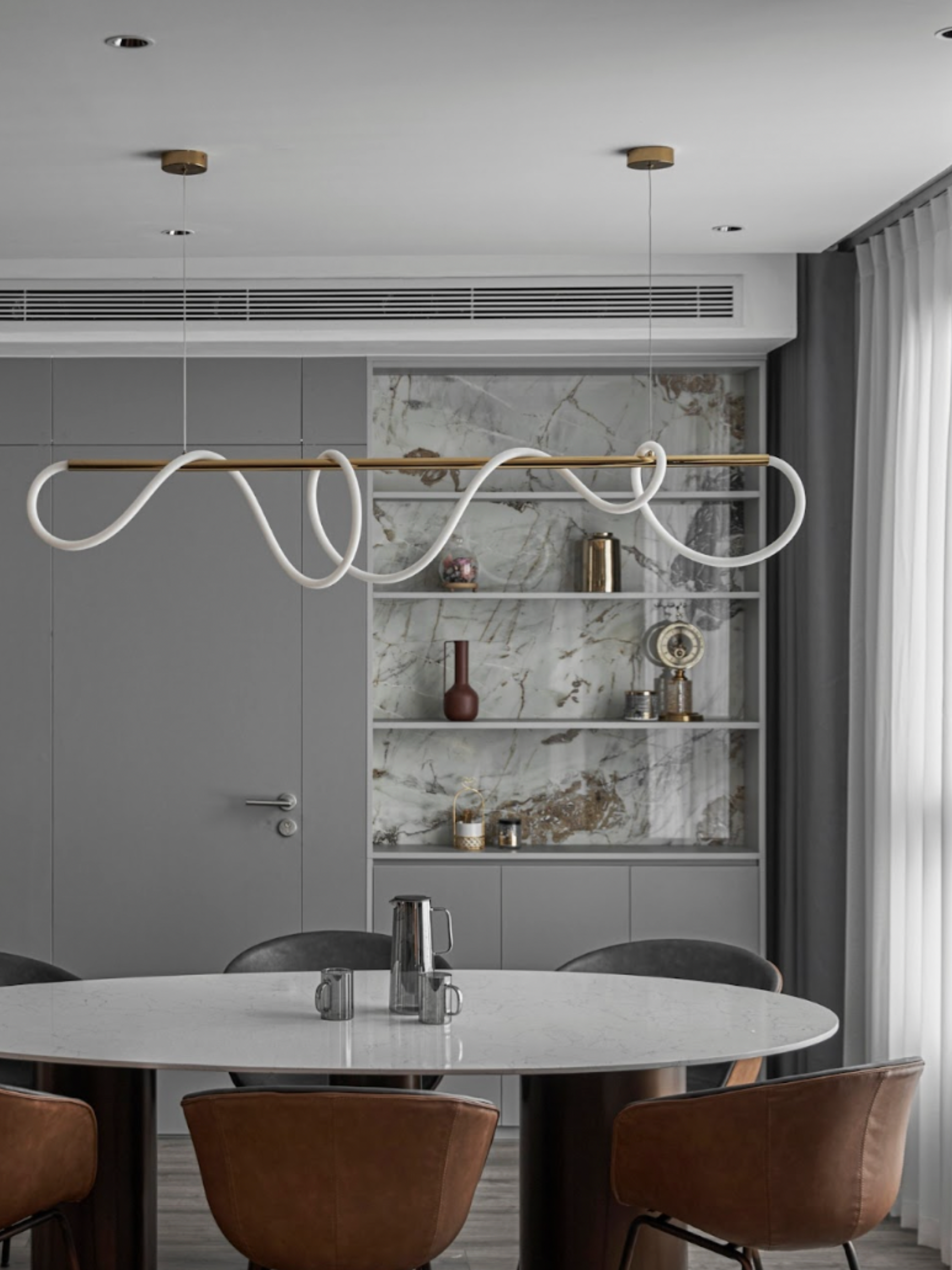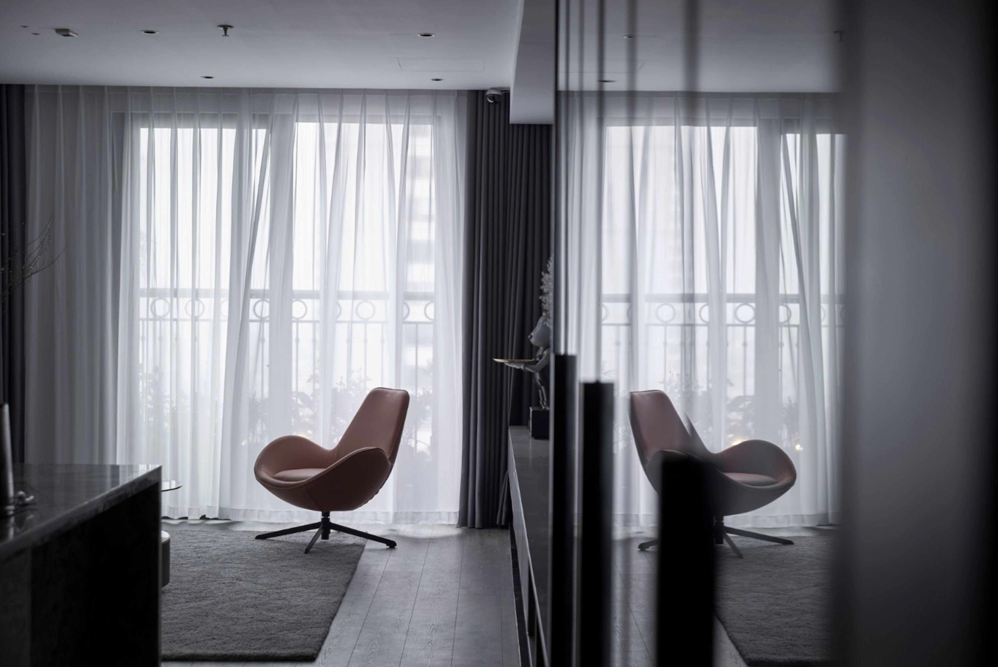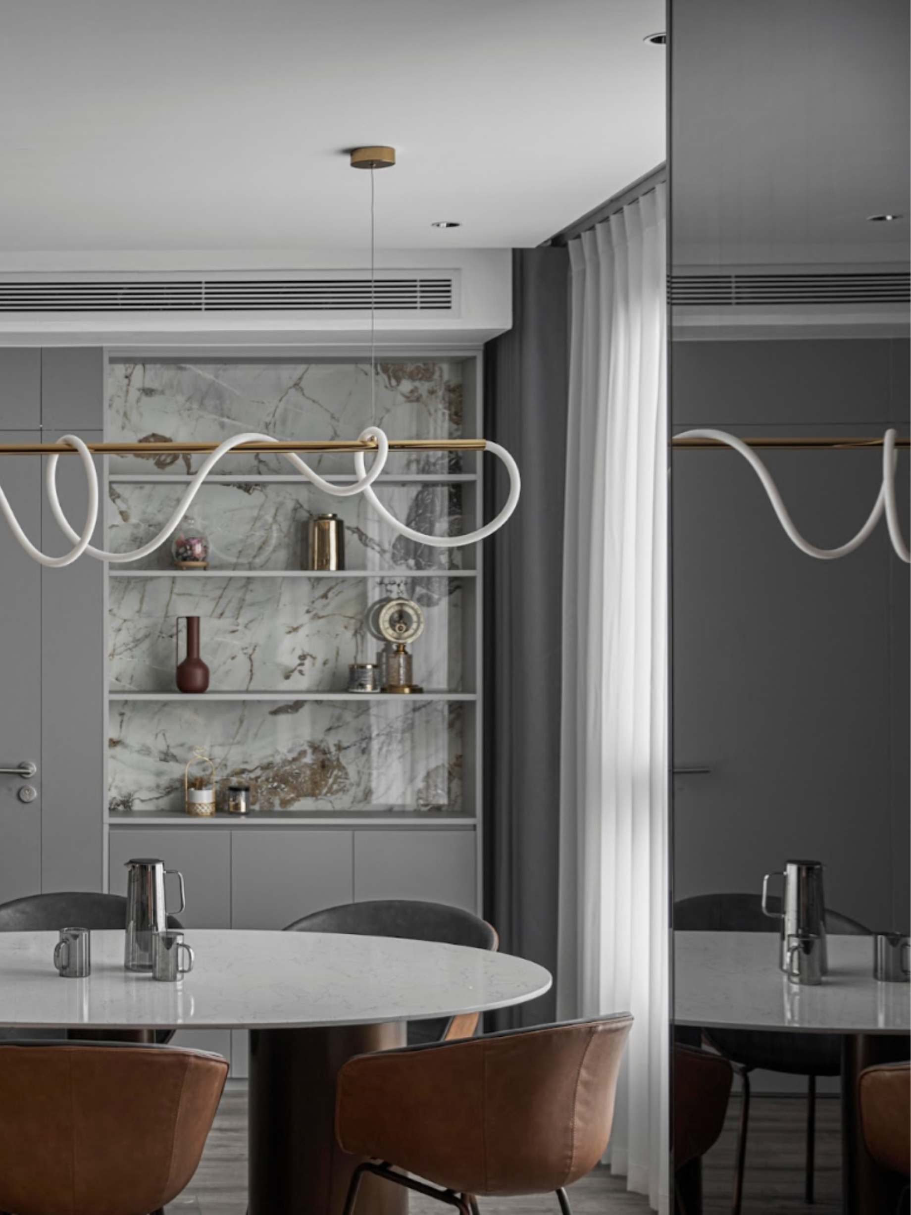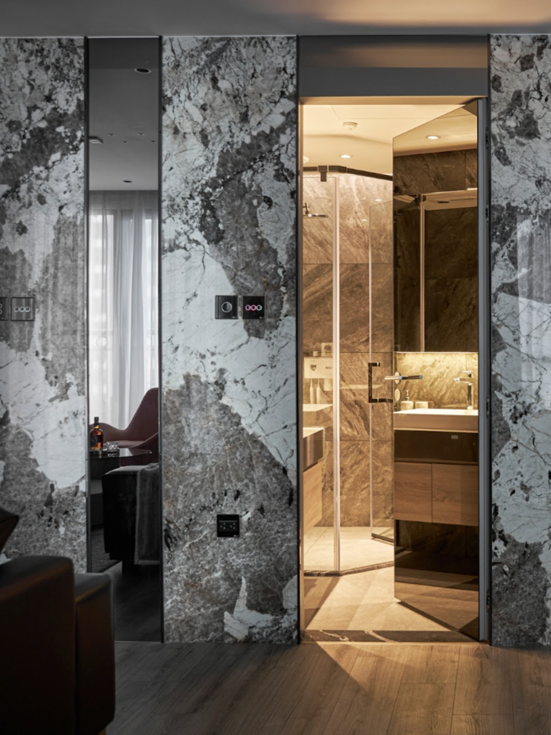 Thay vì để ánh sáng làm nhiệm vụ chiếu sáng đơn thuần, SENDESIGN coi ánh sáng là một lớp cấu trúc vô hình. Ánh sáng gián tiếp được dẫn dắt dọc theo các bề mặt marble, len qua những mảng kính, phản chiếu trên bề mặt bóng – tạo nên cảm giác không gian luôn “chuyển động nhẹ”, dù hình khối đứng yên.