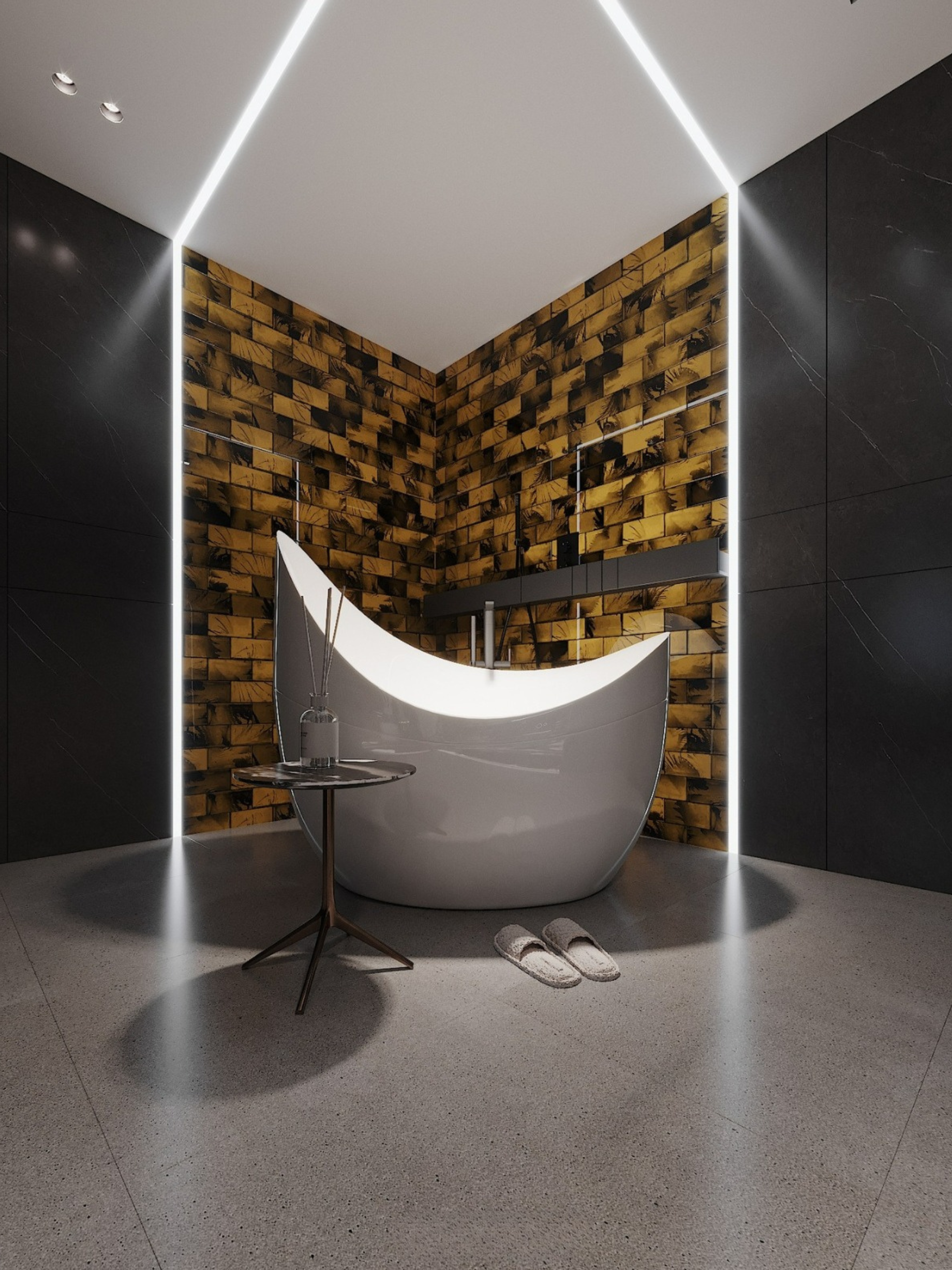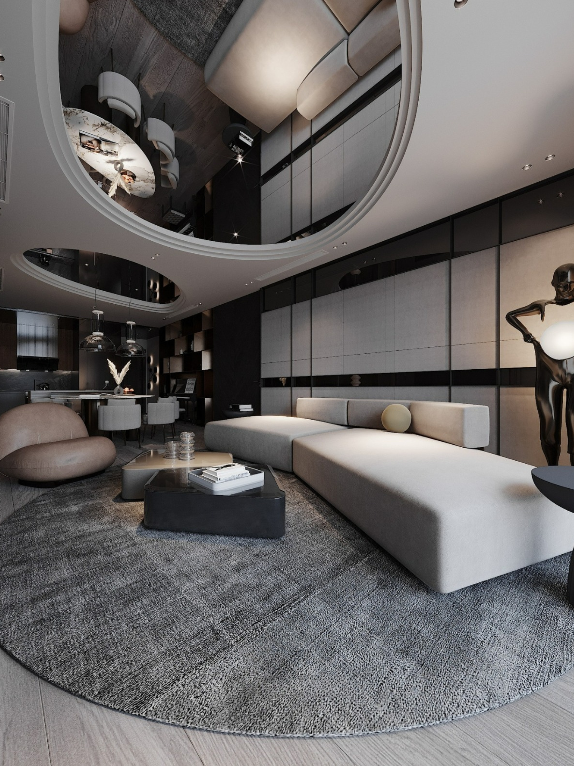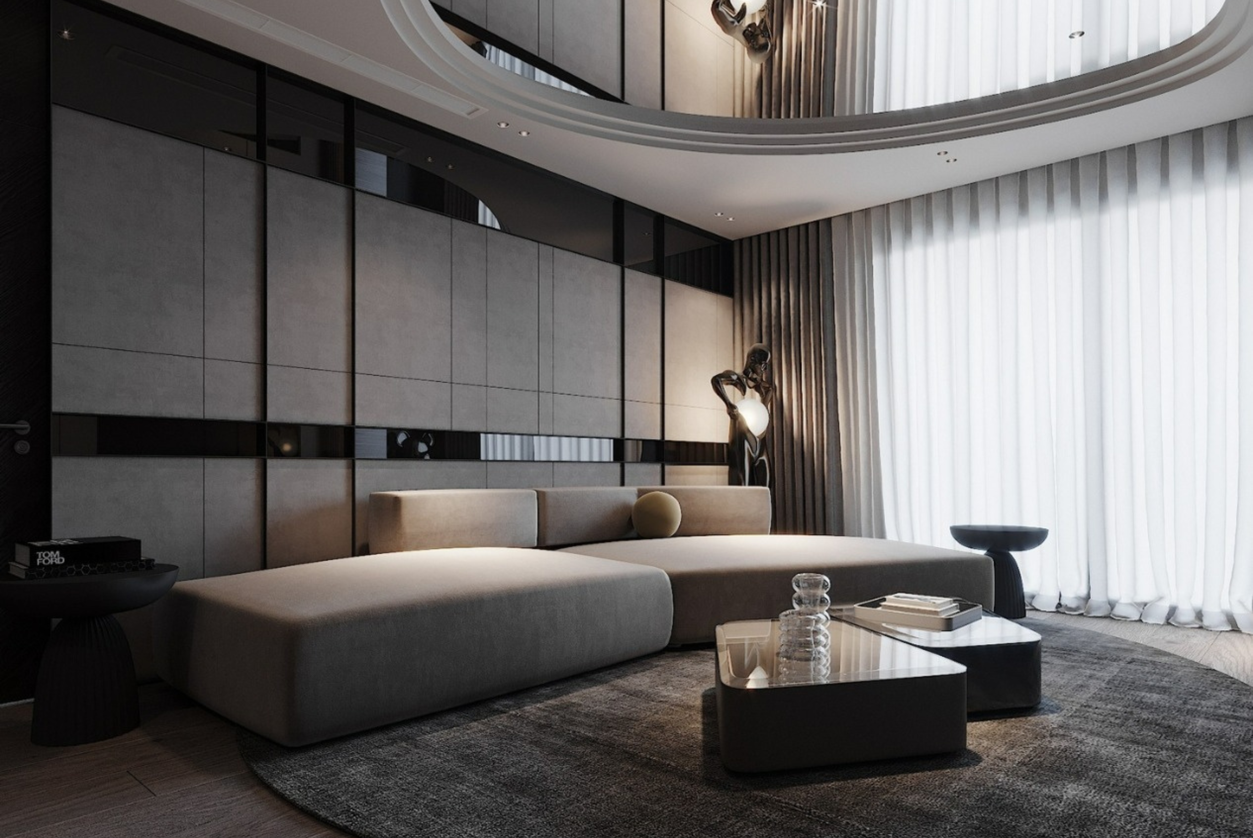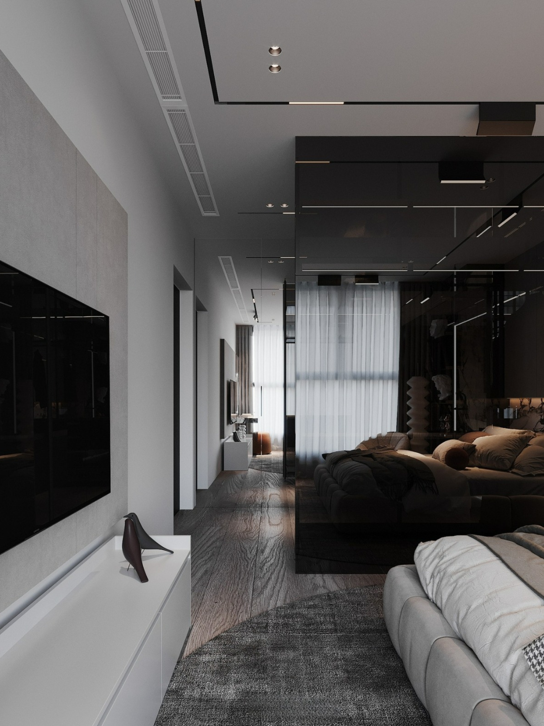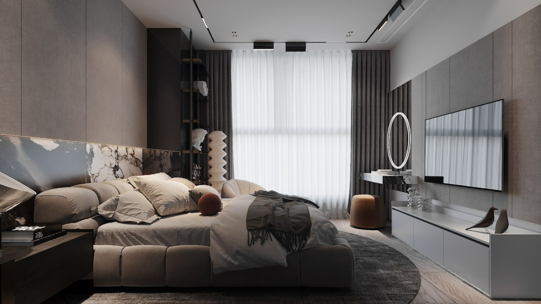 Ánh sáng không dàn trải mà được tiết chế có chủ đích để tạo nên độ "Moody" (Huyền bí) cần thiết. Những dải LED định hình chạy dọc theo đường cong trần nhà hay hắt nhẹ dưới chân nội thất tạo nên cảm giác "bay bổng" không trọng lực. Khi màn đêm buông xuống, căn hộ chuyển mình thành một Private Lounge sành điệu và đầy mê hoặc.