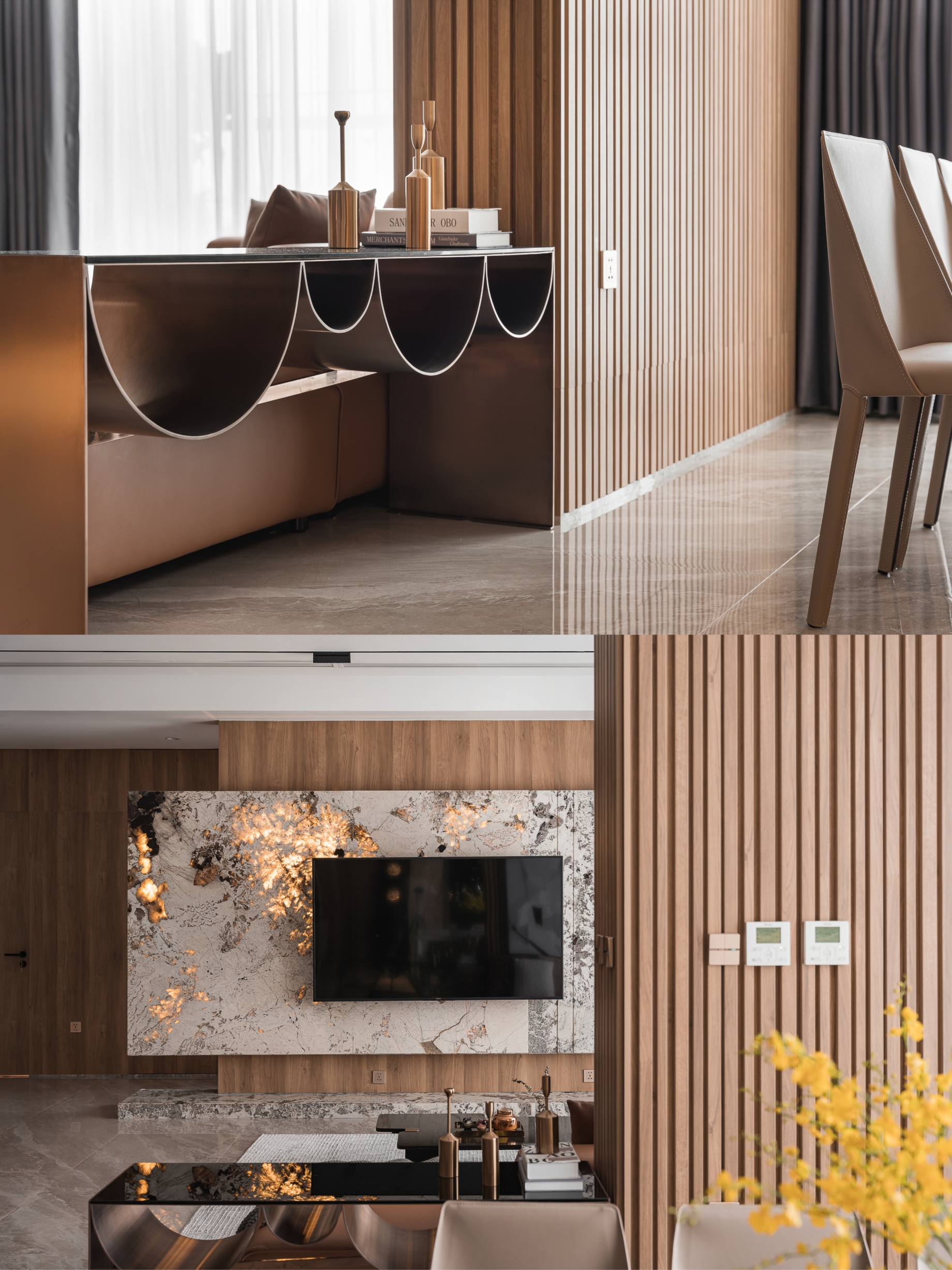 Không gian phòng khách trở thành “tuyên ngôn” thị giác với bức tường đá tự nhiên độc bản, nơi vân đá như những mảng màu nghệ thuật được ánh sáng hắt chiếu làm nổi bật. Xung quanh là sự cân bằng của gỗ ấm, tạo cảm giác gần gũi, mềm mại nhưng không kém phần quyền lực.