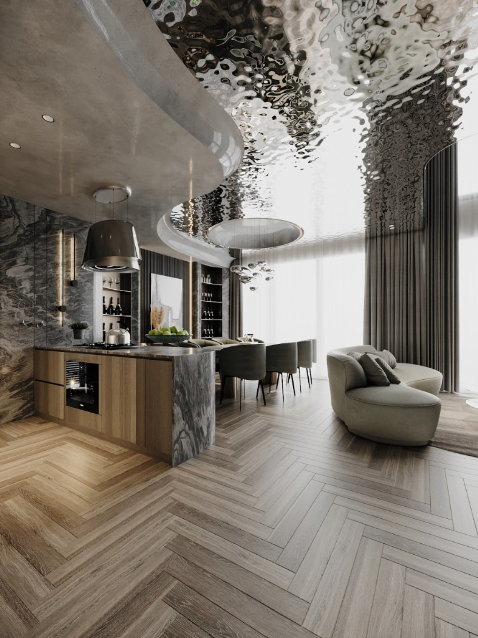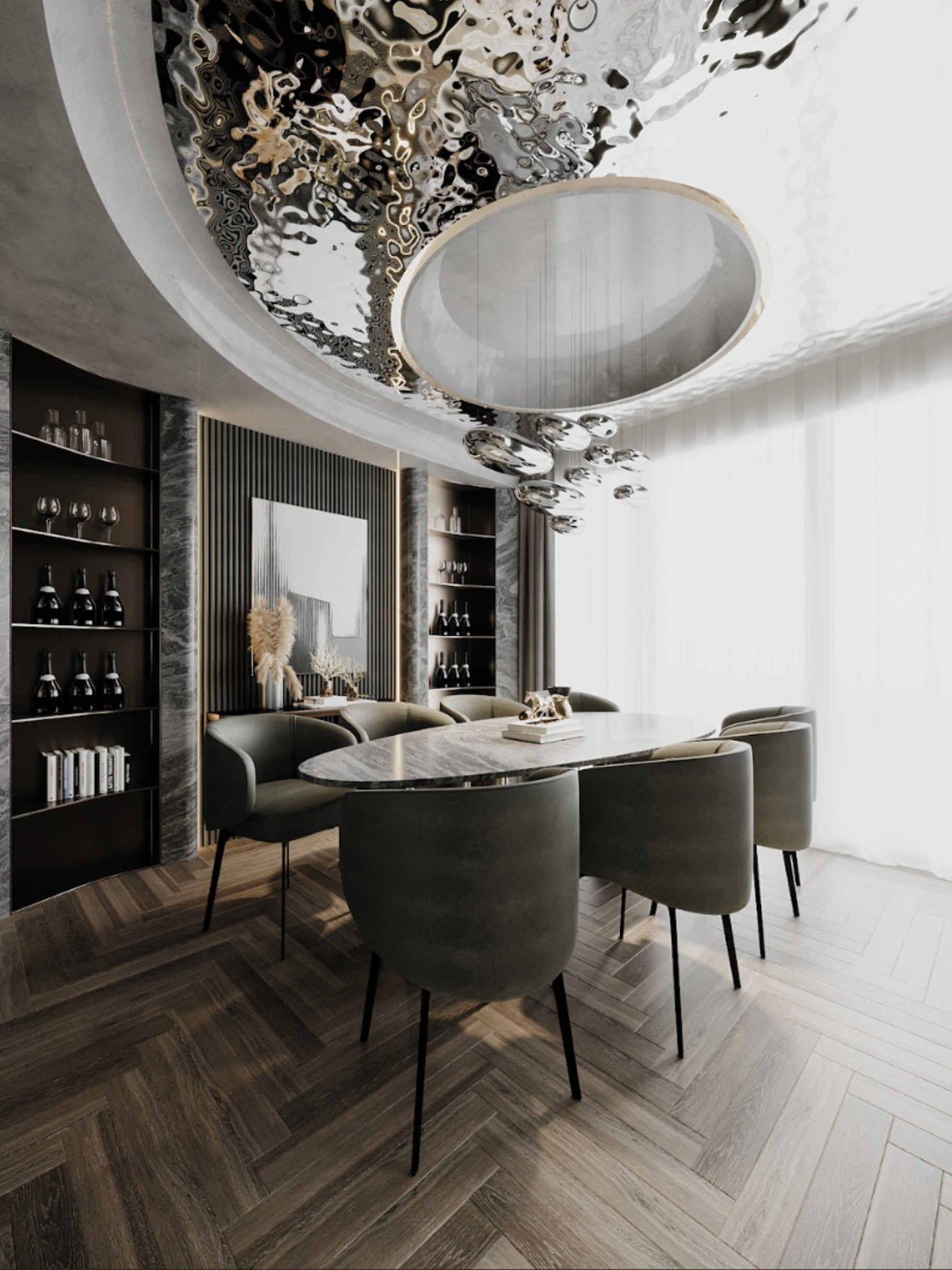 Trần nhà được xử lý như một chuyển động mềm, với hiệu ứng kim loại lỏng phản chiếu ánh sáng một cách tiết chế, mở rộng không gian mà không phô trương. Trong tổng thể ấy, cầu thang xoắn ốc đen vươn lên như một nét phác thảo dứt khoát, còn cây đàn piano đen bóng đặt ở trung tâm trở thành điểm dừng cảm xúc - nơi cổ điển và đương đại gặp nhau trong trạng thái cân bằng tự nhiên.