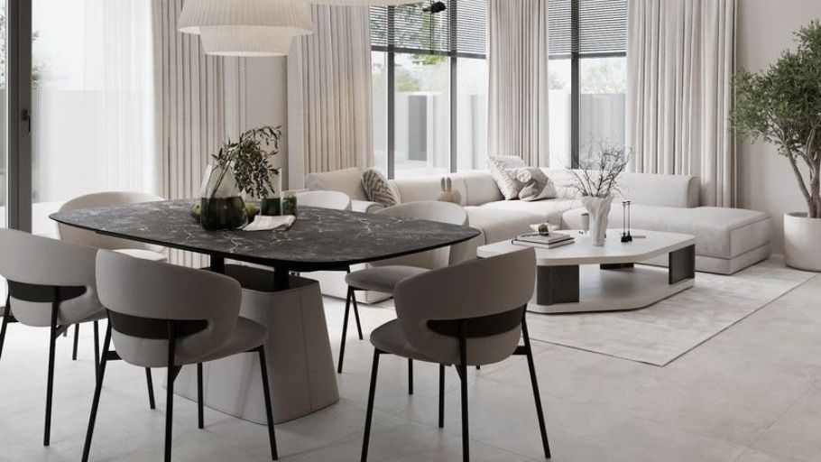 Đóng vai trò là "trái tim" của ngôi nhà, phòng khách biệt thự liền kề thường khéo léo đánh lừa thị giác để mở rộng không gian. Bảng màu trung tính như ghi, be, hay greige (xám pha be) thường được ưu tiên làm nền tảng. Sự sang trọng thường được kiến tạo thông qua hệ vật liệu cao cấp: vách TV ốp đá Sintered Stone nguyên khối, thường đi cùng bộ sofa da bò thật nguyên tấm, mang lại cảm giác bề thế và êm ái.