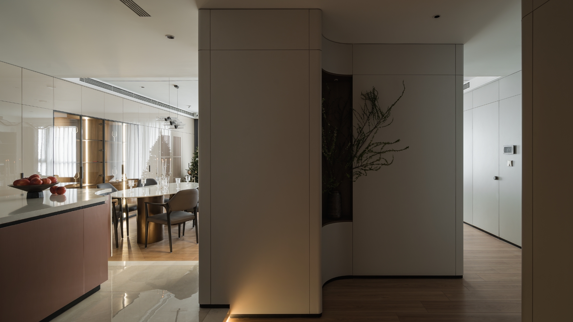 Hệ vách và cột được SENDESIGN xử lý lại một cách mạch lạc và mềm mại, giúp không gian trở nên hài hòa, dễ chịu ngay khi bước vào. Những chất liệu bền vững từ gỗ sáng cho đến đá tự nhiên được chọn lọc kỹ càng để giữ được vẻ đẹp ổn định theo thời gian, đồng thời nâng giá trị căn hộ trong mắt người thuê hoặc người mua tương lai.