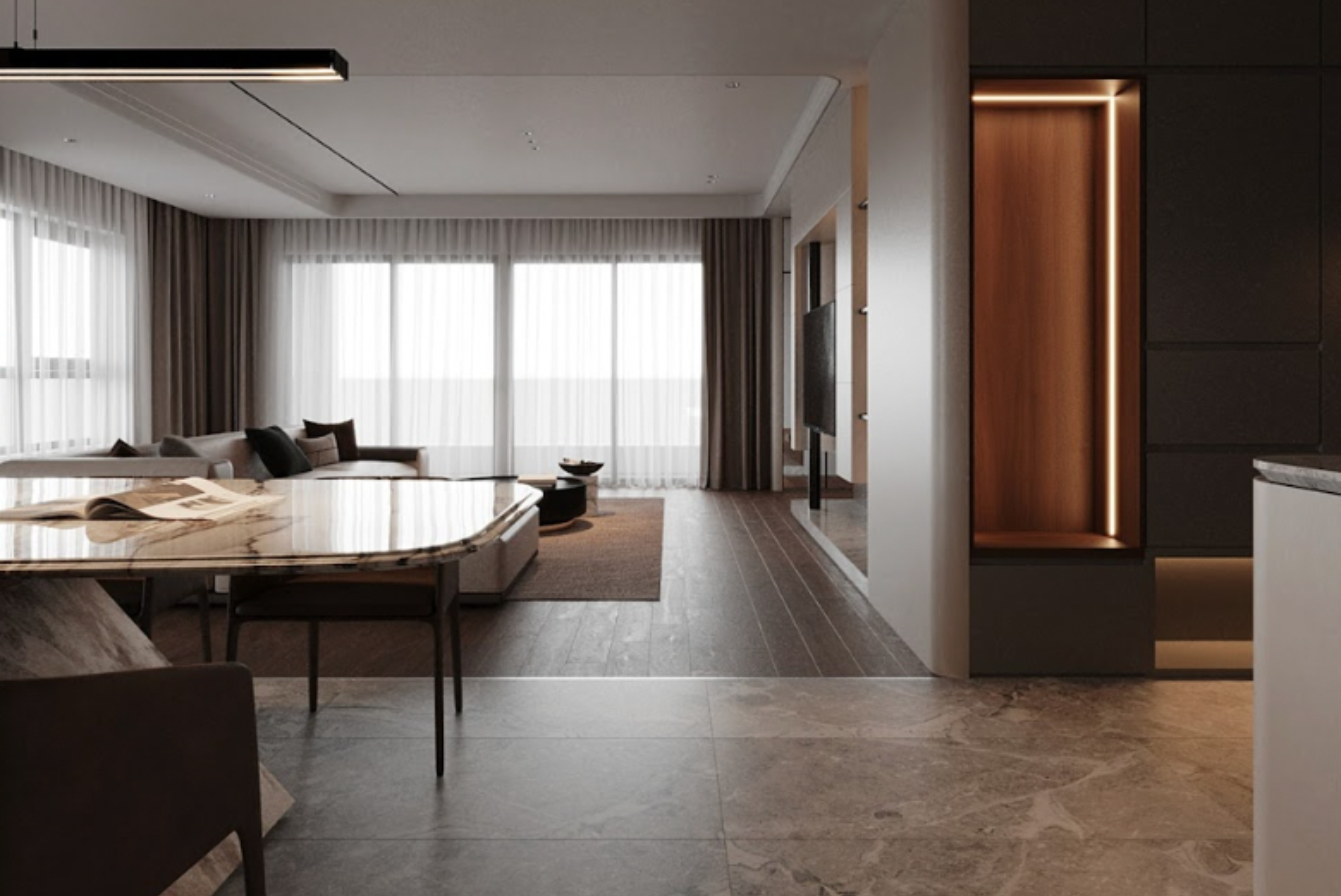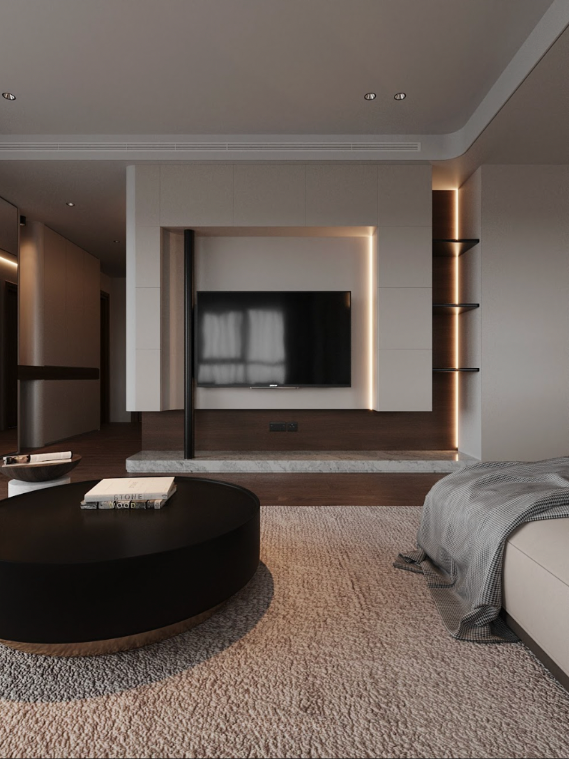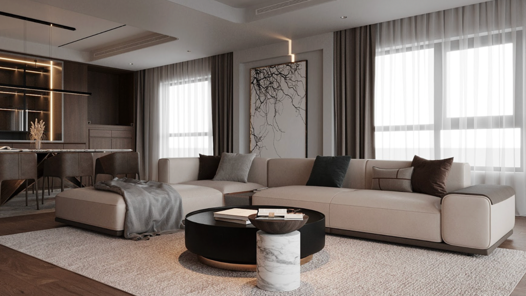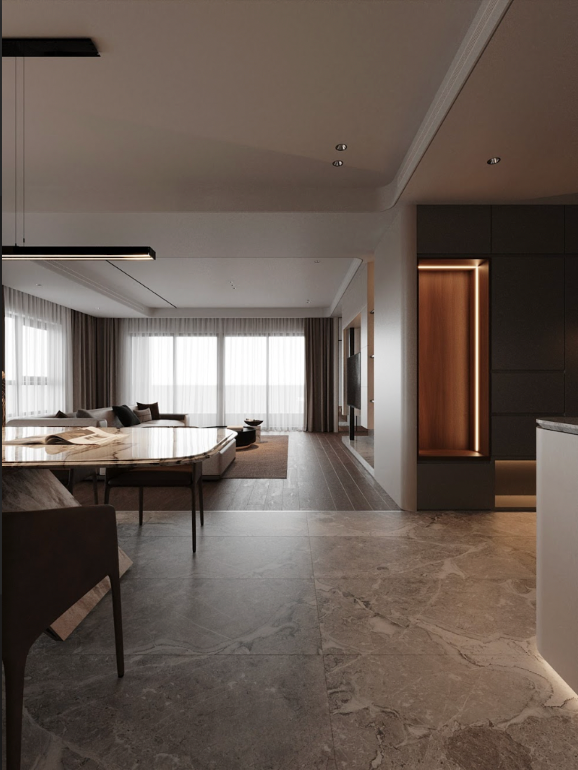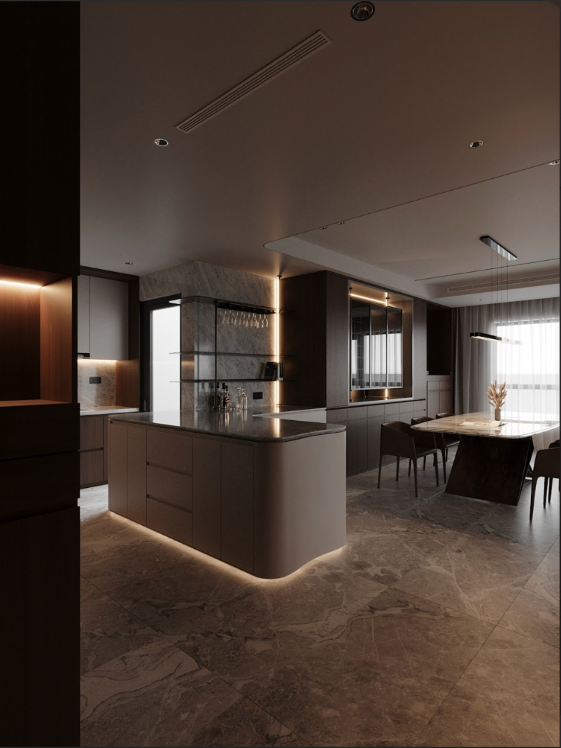 Sự kết hợp vật liệu cao cấp - ánh sáng vàng ấm - đường nét bo tròn tạo nên không gian tinh tế và sang trọng, nơi vẻ đẹp lâu dài và cảm giác ấm cúng đi cùng nhau, mà không cần màu sắc rực rỡ hay chi tiết cầu kỳ.